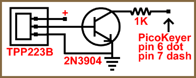 A simple 2N3904 switching circuit was designed to interface the TTB223B with my existing PicoKeyer Plus electronic keyer. This circuit was evaluated and the TT223B/PicoKeyer Plus