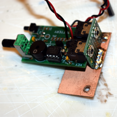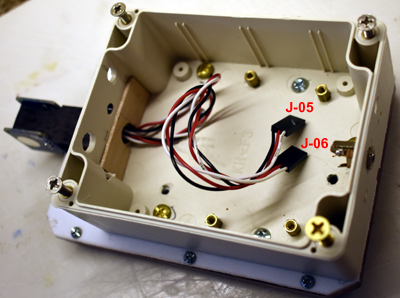 If not already done, it is time to pull the paddle wires into the cabiinet and securely glue the paddle mount to the keyer base. The paddle wires go to J-05 and J-06.