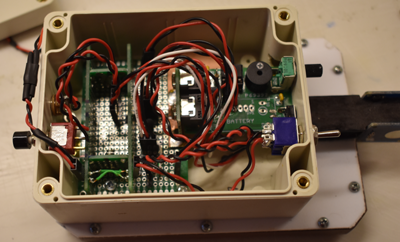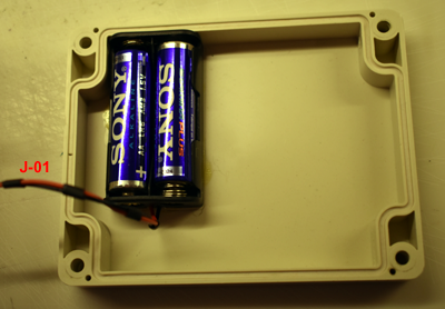 The battery pack with two AA batteries is glued to the top of the cabinet. The two wires are a single ended 2 pin jumper wire that goes to J-01.